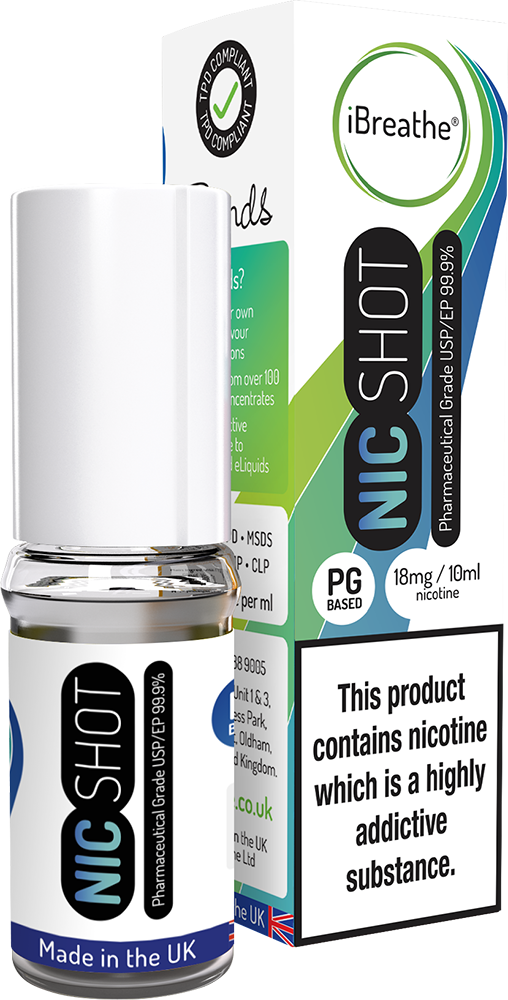 Nic Shots are available in 10ml and have a nicotine strength of 18mg/ml.